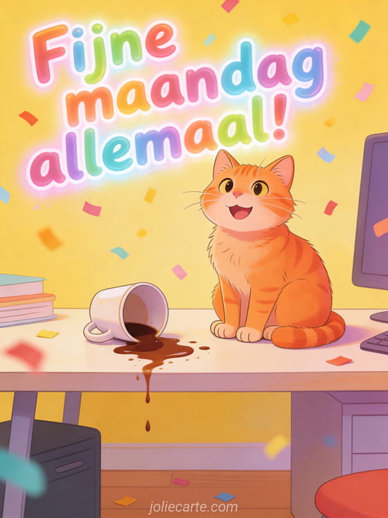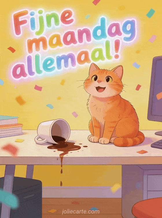 Begin de week met een glimlach dankzij deze fijne maandag met een hilarische rode kat en een omgevallen koffiekop. Ontdek ook een fijne maandag kat kusjes afbeelding, regenachtige fijne maandag afbeeldingen of een fijne maandag kusjes geanimeerde gif.