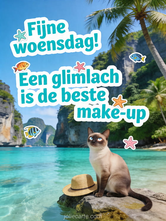 fijne woensdag! een glimlach is de beste make-up een grappige woensdaggroet met zon, zee en een speelse glimlach