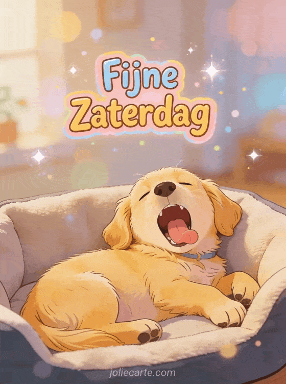 Grappige fijne zaterdag humor gif een hilarische fijne zaterdag gif met een slaperige golden retriever puppy in een komische ochtendscene