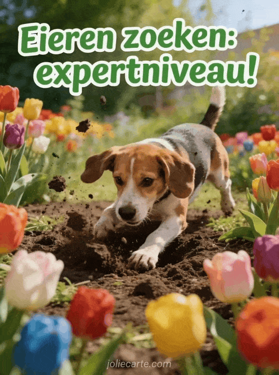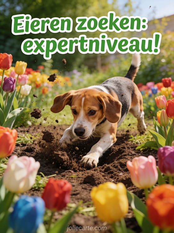 Grappige pasen humor een humoristische paaskaart met een beagle die enthousiast eieren zoekt in de tulpen