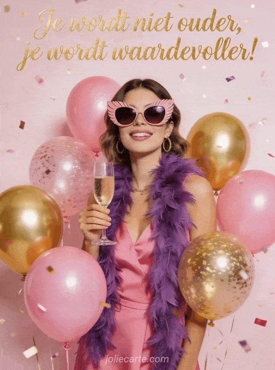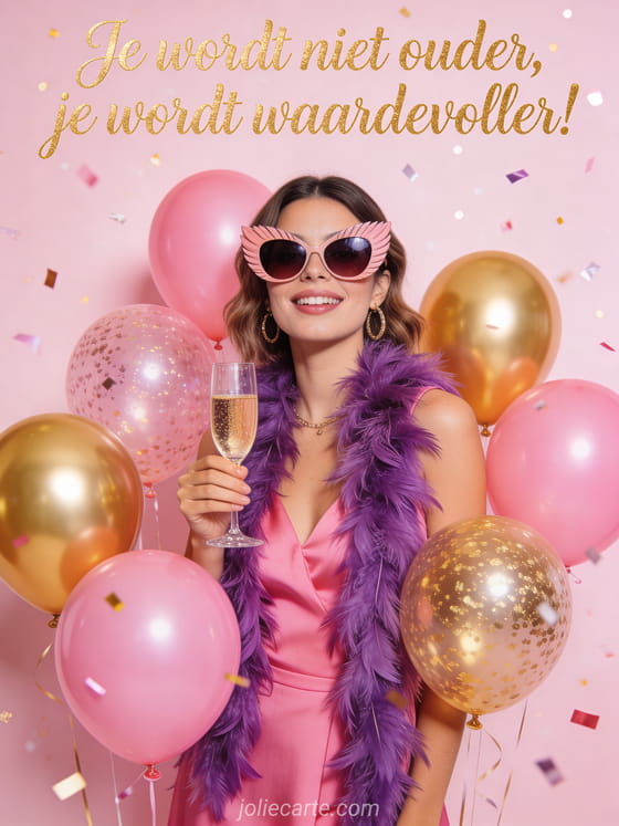 Laat haar lachen op haar verjaardag met deze glamoureuze flamingo. Met oversized zonnebril, paarse vederboa en een glas champagne in de hand — want ze wordt niet ouder, ze wordt waardevoller! Ontdek ook een sms verjaardag vrouw of een fijne verjaardag vrouw.