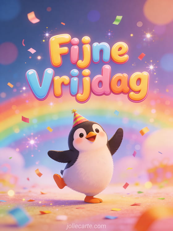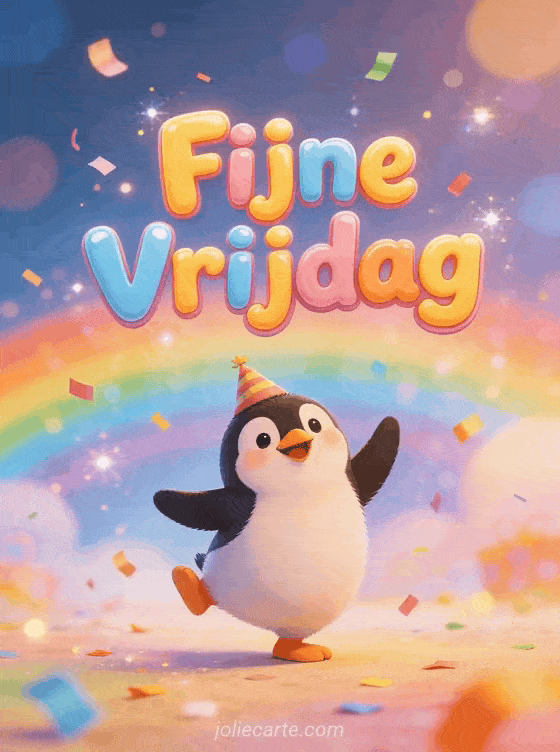 Grappige vrijdag gif een grappige en feestelijke vrijdag gif met een dansende pinguïn en confetti
