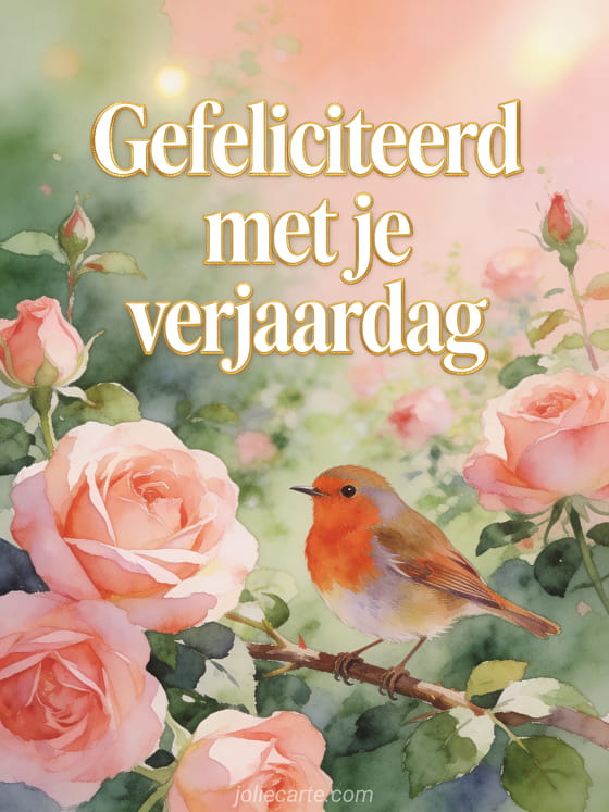 Een elegante aquareltuin vol bloeiende rozen met een roodborstje op een tak in zachte zalm- en groene tinten. Bekijk ook gif verjaardag vrouw of verjaardag vrouw.