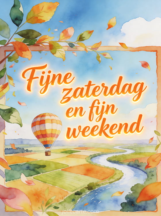 Deel een vrolijke zaterdag- en weekendgroet met oranje letters, een gestreepte luchtballon, lappendekenvelden, een slingerende rivier en open hemel. Ontdek ook een fijne zaterdag en weekend afbeelding, fijne zaterdag bloemen afbeeldingen of sprankelende fijne zaterdag afbeeldingen.