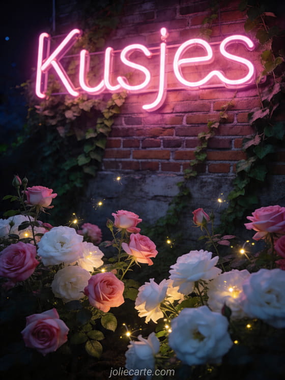 Deel een tedere kusjesgroet met deze romantische kaart van roze en witte stokrozen in een nachttuin met vuurvliegjes. Ontdek ook liefdeskusjes stel, afbeelding kusjes of kusjes gif.