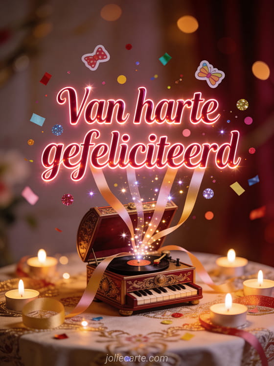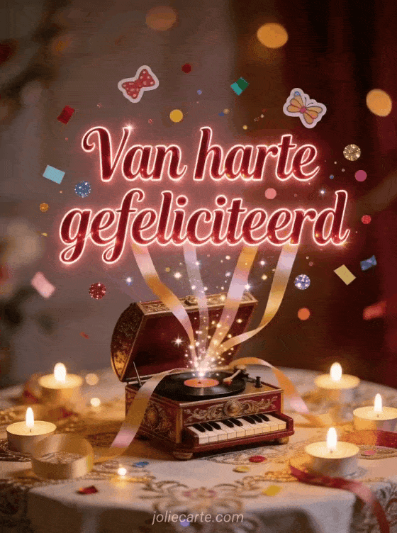 Stuur een hartelijke verjaardagswens met lichtgevende robijnrode letters, kleurrijke confetti, een sierlijke open muziekdoos, vallende linten, kleine kaarsen en warm fonkelend licht. Ontdek ook een verjaardag vrouw natuur, een verjaardagskaart vrouw bloemenboeket of een gratis grappige vrouw verjaardag gif.