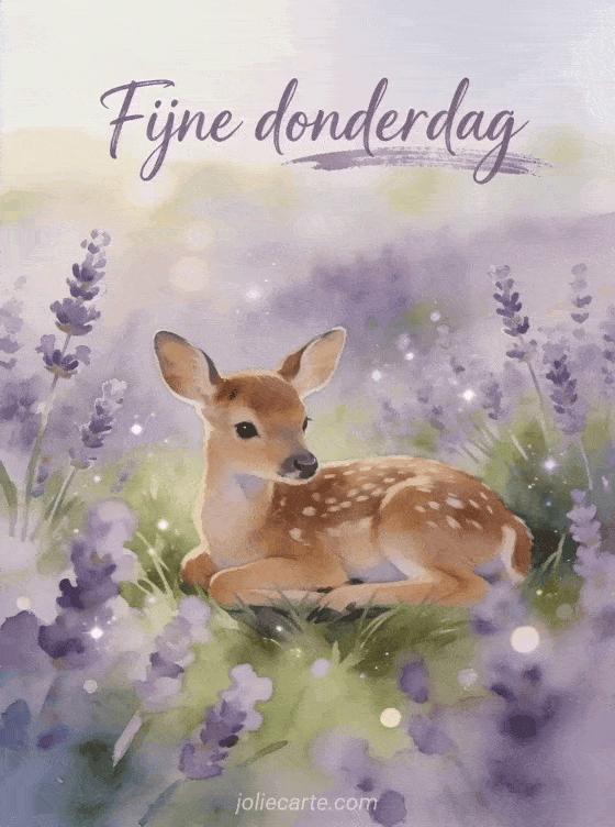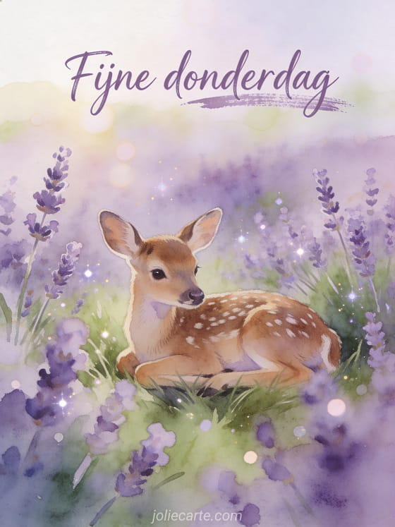 Deel een serene fijne donderdag groet met delicate aquarelletters, een schattig hertenjong dat rust tussen lavendelbloemen en zachte paarse en groene plattelandstinten. Ontdek ook een goedemorgen fijne donderdag afbeelding, goedemorgen fijne donderdag kusjes afbeeldingen of een fijne donderdag glimlach kaart.
