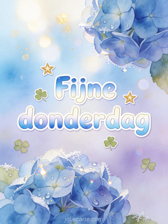 Stuur een delicate fijne donderdag met blauwe hortensia's, sprankelende dauw, fijne rijp en een lavendelpastel achtergrond. Ontdek ook een fijne donderdag wensen afbeelding, fijne dag donderdag of fijne donderdag kat.