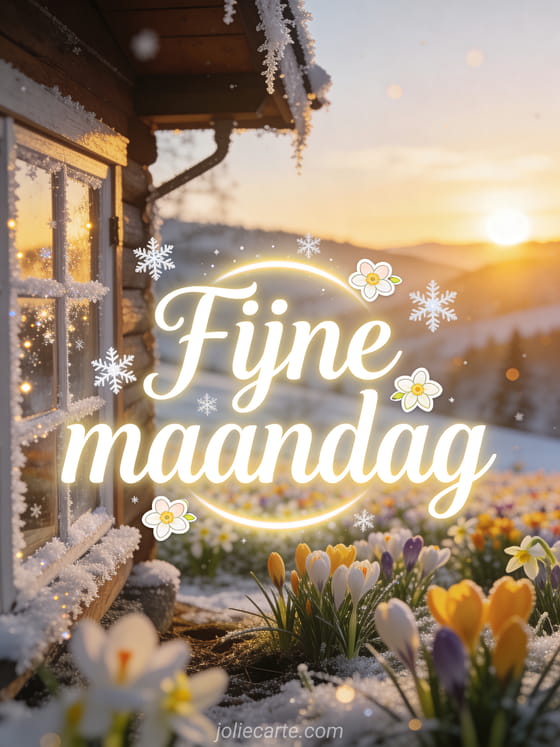 Verstuur gratis fijne maandag kaarten met elegante witte letters, sneeuwvlokken, kleine madeliefjes en een bloeiende vallei bij gouden zonsopkomst. Deel een frisse wens voor het begin van de week en ontdek ook fijne maandag en fijne week afbeelding, fijne maandag kusjes gif of mooie goedemorgen maandag afbeeldingen.