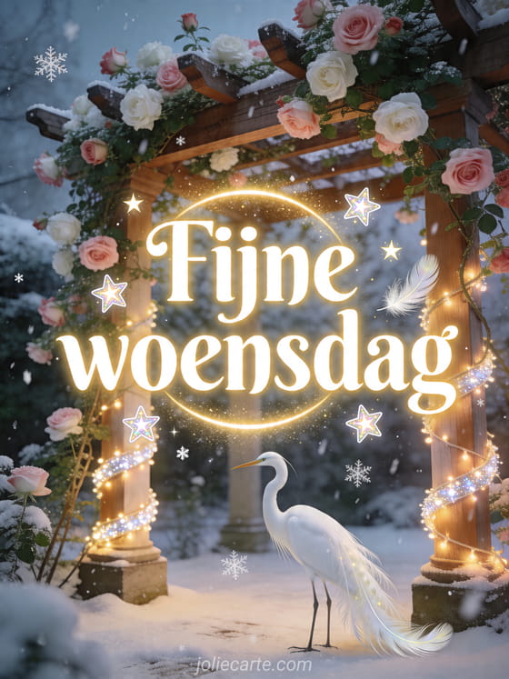 Deel een magische Fijne woensdag groet met een bloeiende pergola, een majestueuze witte reiger en fonkelende winterlichten. Bekijk ook gif afbeeldingen fijne woensdag, fijne woensdag boodschap en fijne woensdagavond afbeelding.
