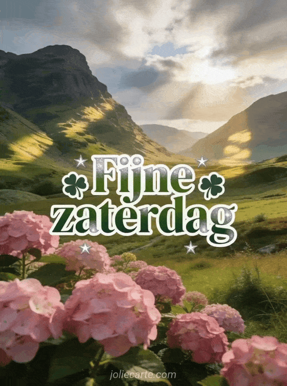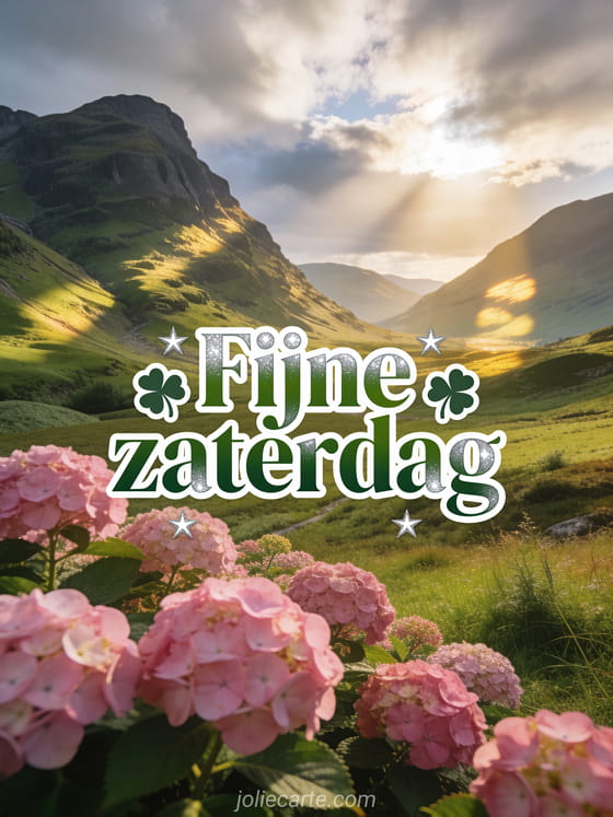 Stuur een mooie fijne zaterdag met realistische valleien van de Schotse Highlands, glooiende weiden, roze hortensia's en gouden zonlicht door de wolken. Ontdek ook fijne zaterdag prachtige afbeeldingen, fijne zaterdagavond gif of fijne zonnige zaterdag.