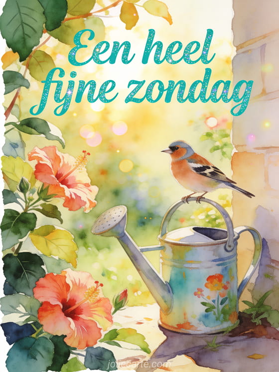 Deel een zonnige zondagwens met een aquareltuin, hibiscusbloemen en een kneu op een beschilderde gieter. Bekijk ook een fijne zondag zon gif, een fijne zondag met koffie afbeelding of een fijne zondag kat gif.