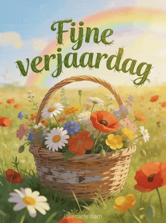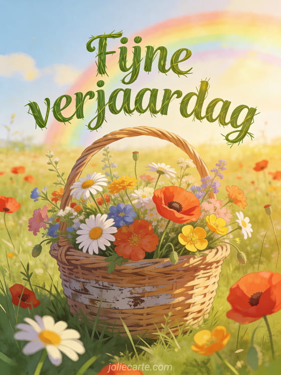 Stuur een vrolijke landelijke verjaardagsgroet met een rieten mand vol kleurrijke veldbloemen in een weide met klaprozen en een regenboog in de verte. Gouden avondlicht maakt het af. Bekijk ook gefeliciteerd verjaardag bloemen gif geanimeerd of gif gefeliciteerd verjaardag vuurwerk geanimeerd.