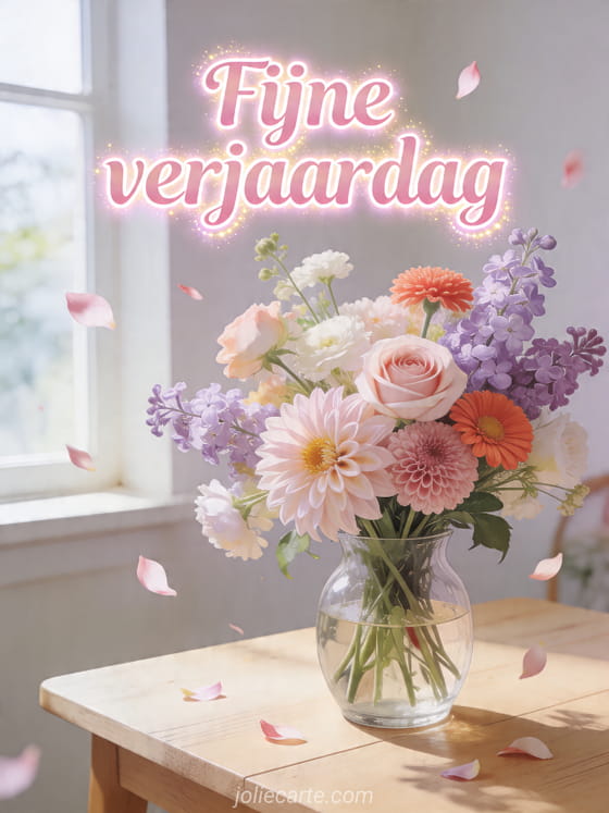 Stuur een stralende verjaardagswens met deze weelderige bloemenkaart vol rozen, dahlia's, ranonkels en seringen. Bekijk ook een dromedaris verjaardagskaart geanimeerd gratis muzikaal per sms, een verjaardagskaars geanimeerde gif of een gefeliciteerd animated gif.