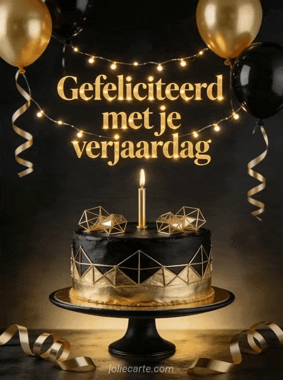Vier zijn verjaardag met stijl en klasse. Een elegante taart bedekt met zwarte en gouden fondant met geometrische gouden decoraties en een gouden kaars, gouden en zwarte ballonnen en slingers op een donkere chique feestachtergrond. Ontdek ook een gifs gefeliciteerd verjaardag man of een komisch gefeliciteerd verjaardag man.