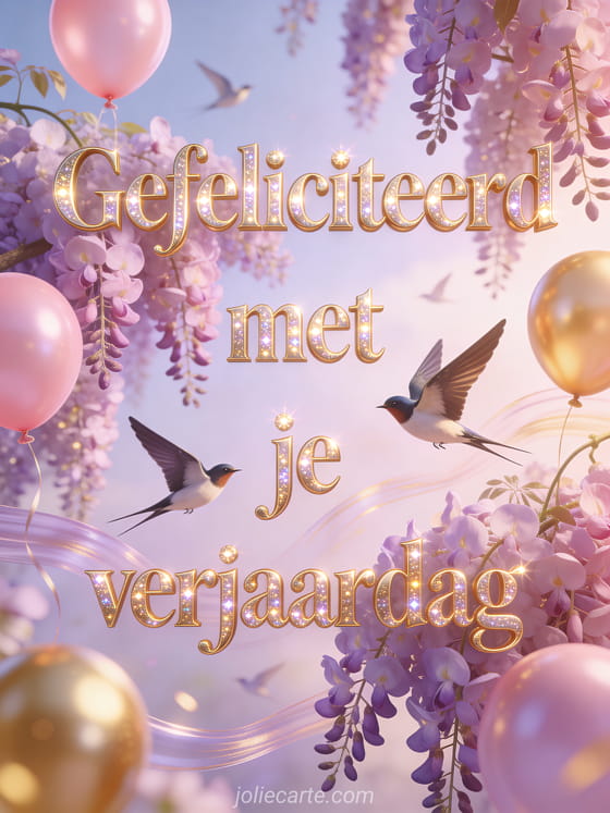 Verras haar met deze lentevolle verjaardagskaart. Sierlijke zwaluwen vliegen tussen trossen blauwe regen en roze en gouden ballonnen in lila roze en gouden tinten en zacht voorjaarslicht — delicaat en tijdloos. Ontdek ook een ontroerend tekst verjaardag vrouw of een champagne gefeliciteerd verjaardag vrouw.