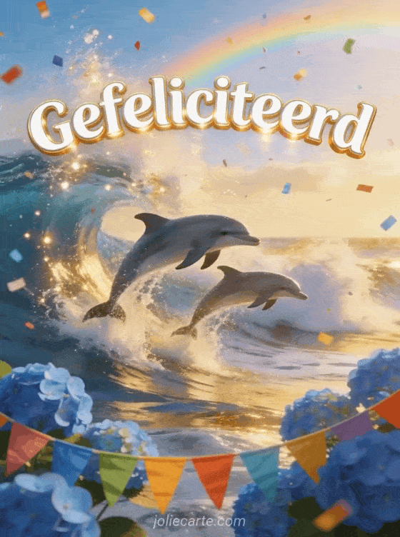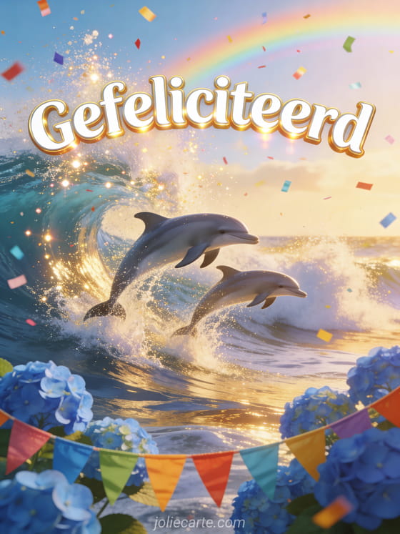 Stuur een vrolijke gratis geanimeerde virtuele gefeliciteerd kaart met springende dolfijnen, kleurrijke confetti en blauwe hortensias. Bekijk ook een geanimeerde verjaardagskaart jongen of een gratis geanimeerde e-kaart verjaardag.