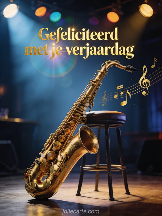 Verras een man met deze elegante verjaardagskaart met een gouden saxofoon in een jazzclub. Ontdek ook een gefeliciteerd verjaardagskaart man of een champagne verjaardagskaart man.