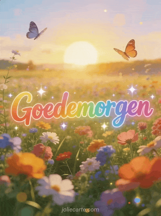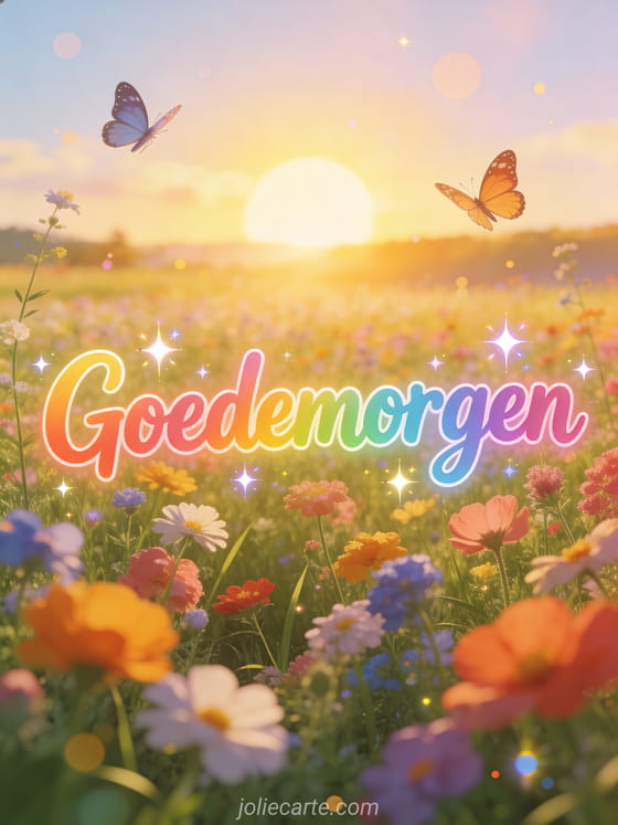 Stuur een prachtige goedemorgengroet met een veld van kleurrijke wilde bloemen tot aan de horizon onder een gouden ochtendzon, met dansende vlinders. Bekijk ook een hallo gaat het goed of een hallo hoe gaat het met je.