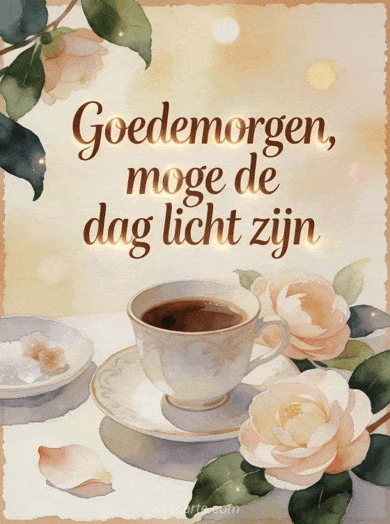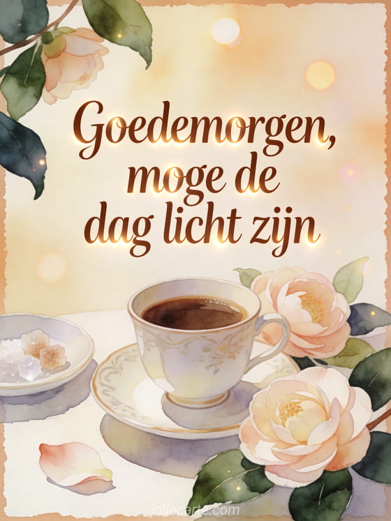 Wens een lichte en zachte dag met een porseleinen kop koffie, camelia's, een lichte schotel en sprankelende suikerkristallen in warm aquarellicht. Je kunt ook een koffie goedemorgen koffie geanimeerde gif, een goedemorgen koffie gif of een leuke goedemorgen koffie afbeelding sturen.