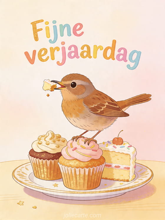Deel een warme verjaardagswens met deze charmante kaart met een kleine mus met een taartkruimel in de snavel op een bord vol versierde cupcakes. Bekijk ook vrouw verjaardag foto, verjaardag vrouw humoristisch of kaart gefeliciteerd vrouw.