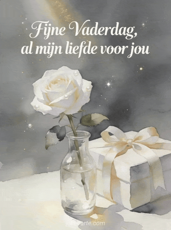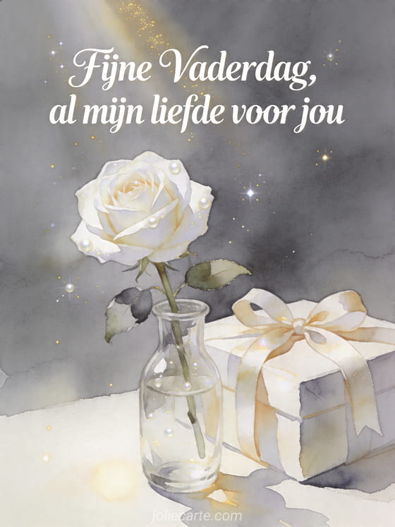 Deel een heldere aquarelkaart voor Vaderdag met één witte roos in een glazen vaas, een cadeau met lint en gouden zonnestralen. Dit rustige, tedere ontwerp is perfect om al je liefde te sturen. Bekijk ook zalig vaderdag, een kaart voor vaderdag of Vaderdag gedicht mijn hart zegt me.