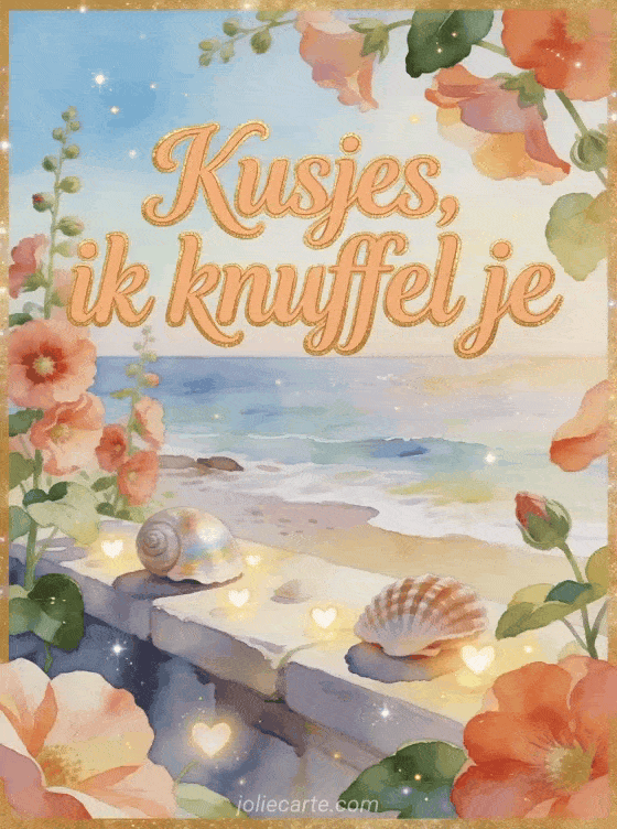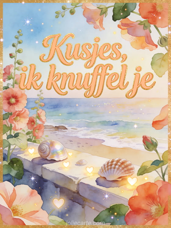 Deel een warme aquarelkaart met abrikooskleurige kalligrafie, een rand aan zee, stokroosbloemen, gepolijste schelpen en kleine hartlichtjes. Stuur meer genegenheid met veel kusjes geanimeerde gif, kusjes hond gif of veel kusjes kat gif.