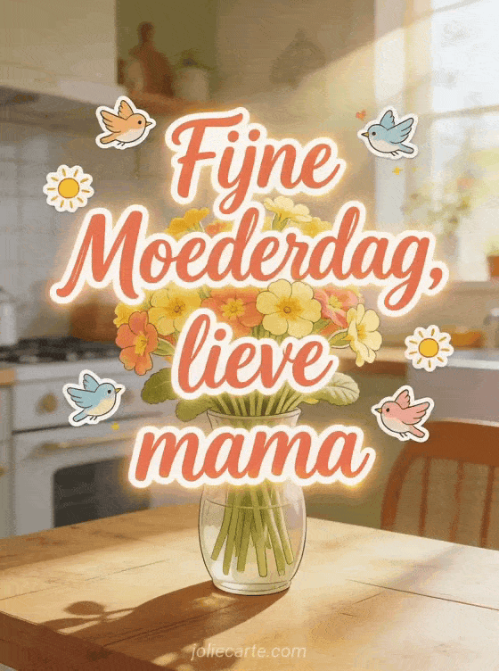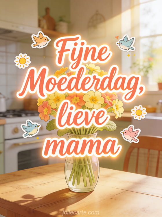 Verras lieve mama met deze schattige gratis moederdagkaart met warm koralen handschrift en verse primula's in een gezellige keukenscene. Ontdek ook gif fijne moederdag of moederdag gif.