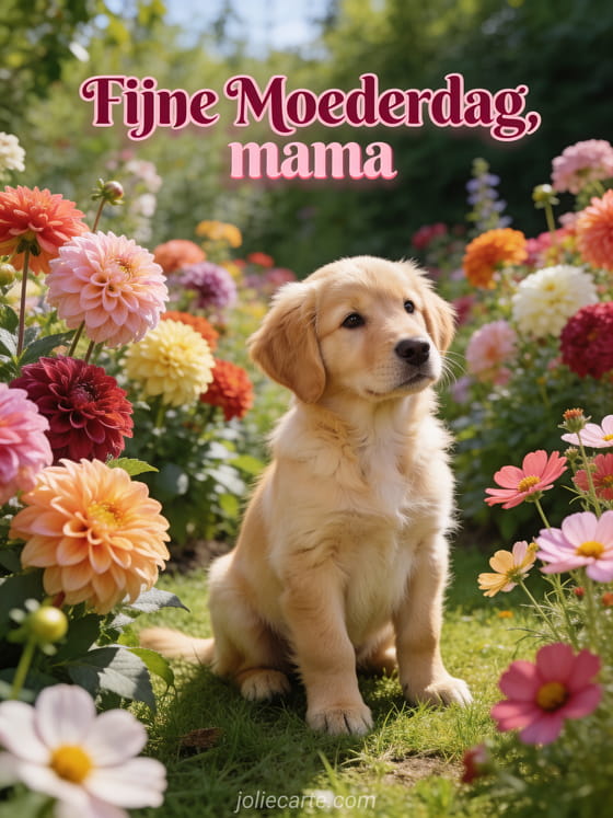 Deel deze vrolijke gratis moederdagkaart. Een Golden Retriever pup zit in een tuin van kleurrijke dahlia's en kosmos en kijkt teder naar de camera. Ontdek ook een fijne moederdag bloemen kaart of een gratis moederdag afbeelding.