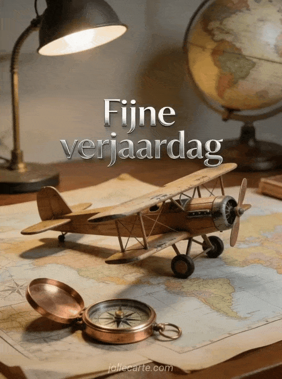 Deel een warme verjaardagswens met deze fotorealistische kaart met een houten vintage vliegtuig, oude kaarten, een koperen kompas en een globe op een bureau. Bekijk ook geanimeerd fijne verjaardag jongen gif, geanimeerde verjaardagskaart 1 jaar of geanimeerde verjaardagskaarten jolie carte.