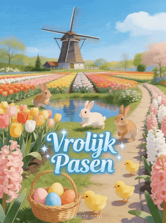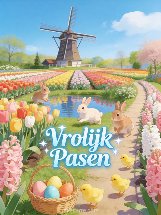 Stuur een vrolijke paaskaart met drie schattige konijntjes spelend tussen rijen bloeiende Keukenhof tulpen, een traditionele hollandse windmolen rijzend achter de bloemenvelden en een kleine vijver die de kleurrijke tulpen en blauwe hemel weerspiegelt. Ontdek ook een gratis kaart vrolijk pasen of een mooie gratis paaskaarten.