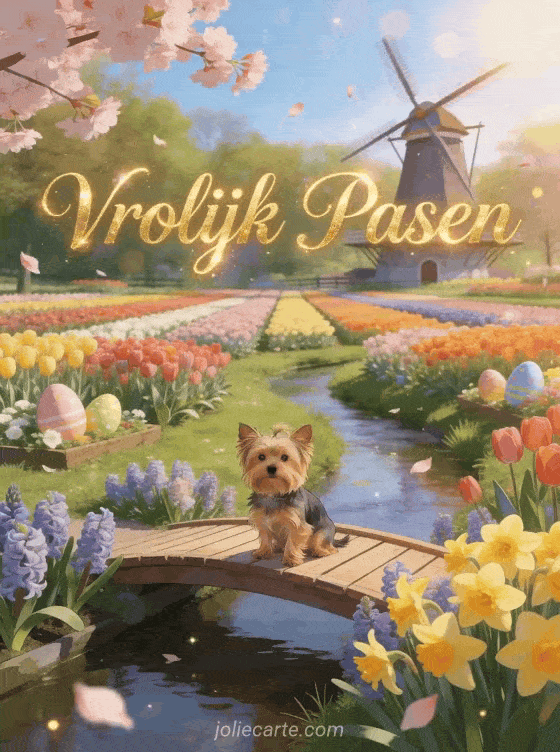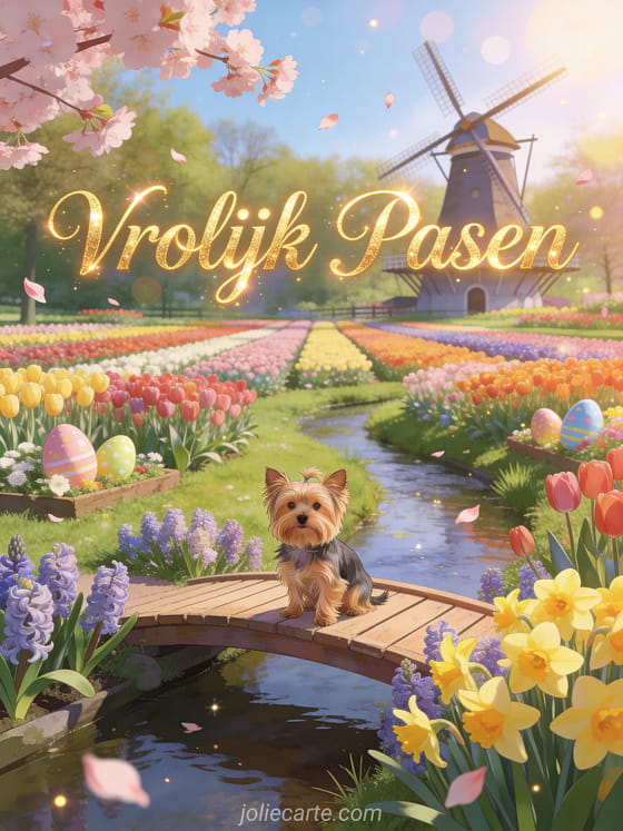 Stuur een prachtige paaskaart met een yorkshire terriër zittend op een houten brug over een zachte stroom met bloeiende hyacinten en narcissen, de Keukenhof met eindeloze rijen veelkleurige tulpen die in de verte reiken en een hollandse windmolen. Ontdek ook een gratis paaskaart dromadaire of een gratis kaart vrolijk pasen.