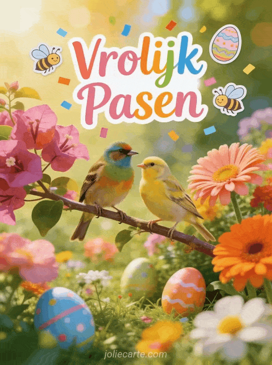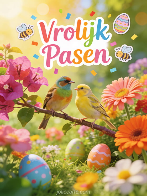 Deel een mooie gratis paaskaart op Facebook. Een verdier en serin zitten samen op een tak met bougainvillea en gerbera's in een lentetuin met verstopte paaseieren. Ontdek ook een pasen wensen kaart of een pasen bericht kaart.