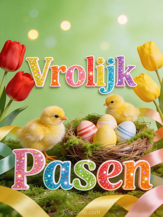 Stuur een gratis vrolijke Pasen-afbeelding met fluffy kuikentjes, rode en gele tulpen en marmerpaaseieren. Ontdek ook een bericht vrolijk pasen of een vrolijk pasen felicitatie.