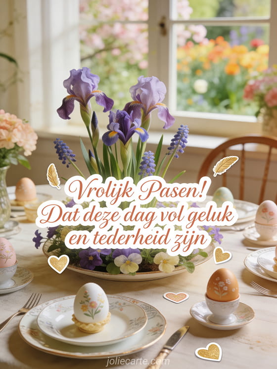 Stuur een prachtige paaskaart met een fotorealistisch lentetafelopstelling met een middenstuk van irissen en aubrieta, sierlijk versierde paasei op fijn porselein en een raam met uitzicht op een bloeiende tuin. Ontdek ook een virtuele paaskaart of een kaart vrolijk paasfeest.