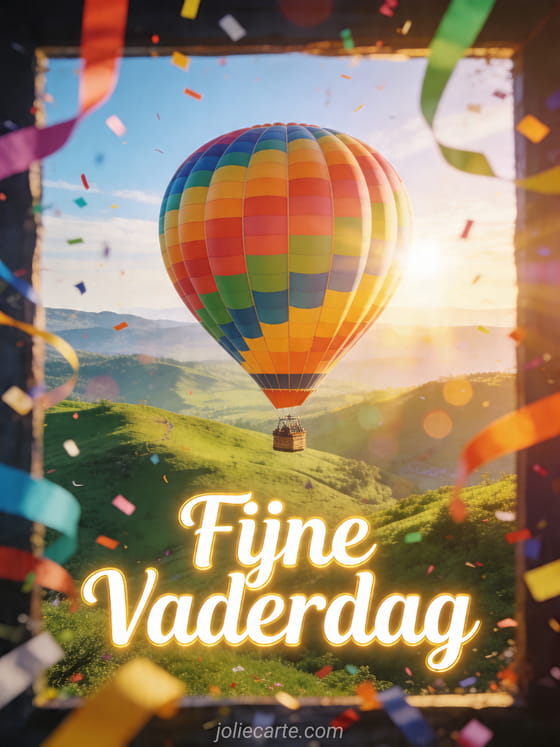 Stuur een gratis Vaderdag afbeelding met een fotorealistische luchtballon boven een zonnige vallei met groene heuvels, kleurrijke serpentines, confetti en stralende luchtgloed. Ontdek ook een mooie Vaderdagkaart, fijne vaderdag voor alle papa's of vaderdag ik mis je.