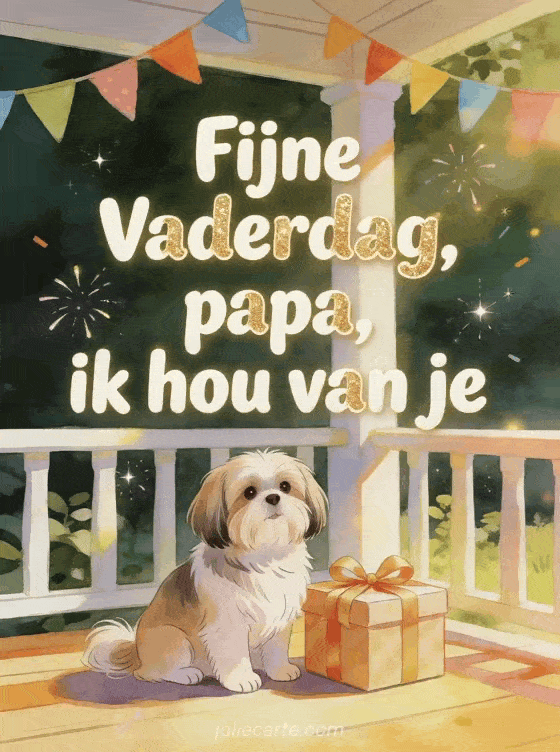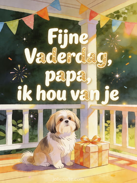 Stuur een gratis Vaderdagkaart met afgeronde ivoorkleurige letters, zachte gouden glitter en een heldere gouache-illustratie van een shih tzu naast een cadeaudoos met lint op een zonnige veranda met kleurrijke slinger. Ontdek ook fijne vaderdag papa afbeelding, liefdevolle woorden voor vaderdag of fijne Vaderdag mijn zoon.