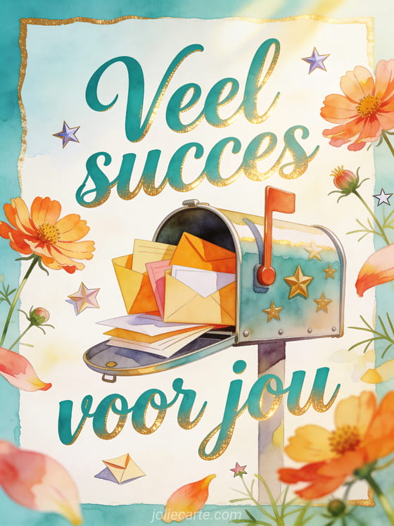 Wens veel succes met een brievenbus vol heldere enveloppen, kosmosbloemen en kleine papieren sterren in helder ochtendlicht. Je kunt ook tekst veel succes voor wat komt, en vooral veel succes gif of veel succes afbeeldingen sturen.