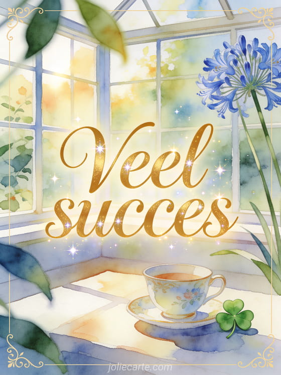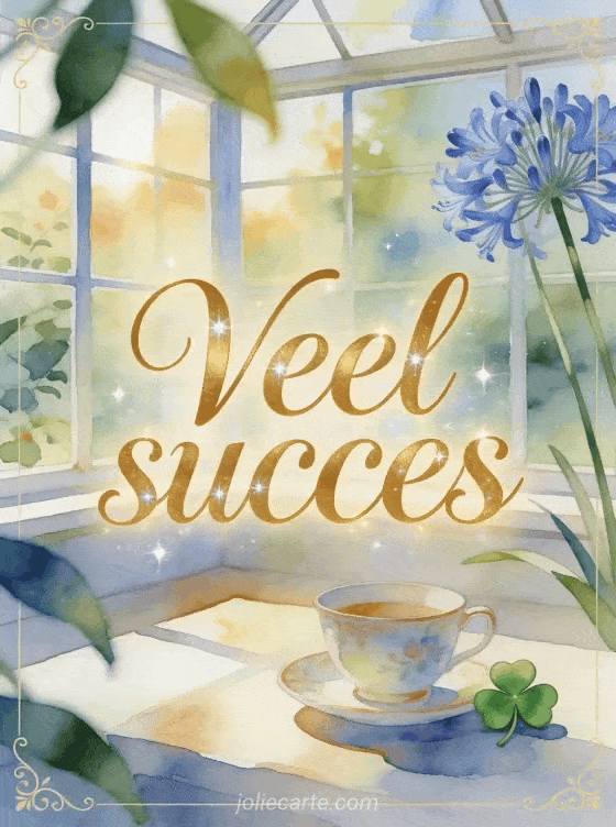 Stuur veel succes met gouden letters, een porseleinen kopje, een kleine groene geluksbrenger en blauwe agapanthusbloemen in een zonnige veranda. Ontdek ook veel succes kaart, veel succes met je examen tekst of gratis geanimeerde succes gifs.