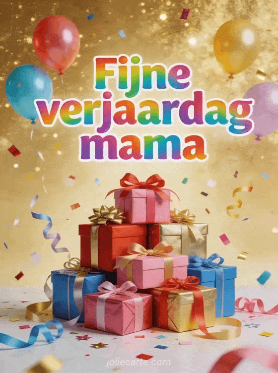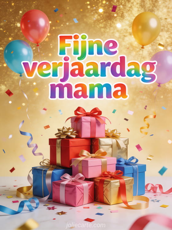 Vier mama met een kleurrijke verjaardagskaart vol regenboogtekst, gestapelde cadeaus, linten, strikken, confetti, slingers, ballonnen en een lichtgevende gouden sfeer. Je kunt ook een fijne verjaardag mijn lieve mama, een fijne verjaardag mama tekening of een kort bericht voor verjaardag mama sturen.