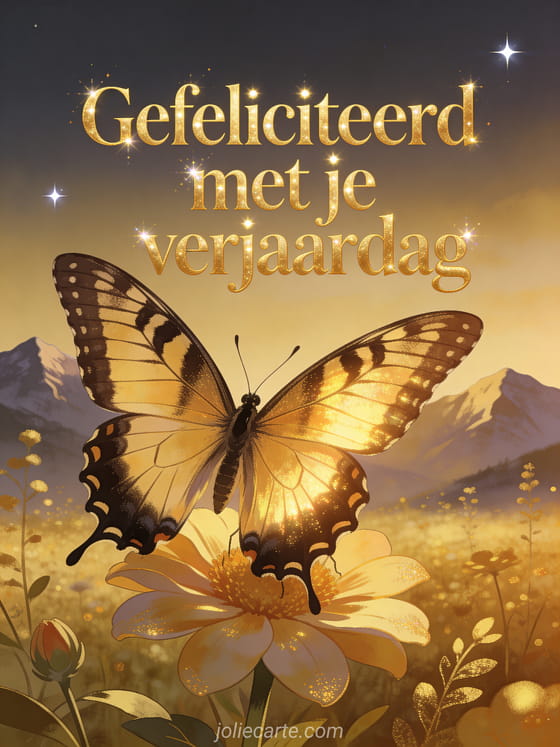 Verras een man met deze majestueuze verjaardagskaart met een prachtige machaonvlinder in een gouden tuin bij schemering. Ontdek ook een verjaardagskaart man oldtimer of een verjaardagskaart man motorfiets.