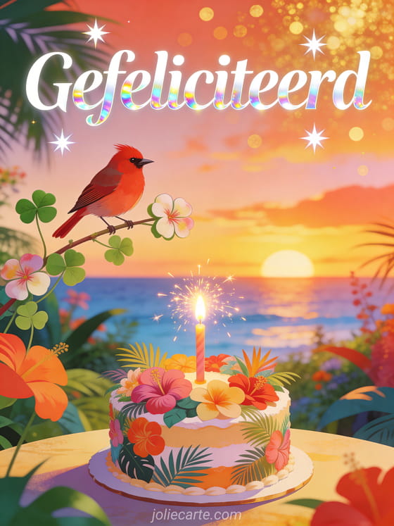 Stuur een levendige gratis verjaardagskaart voor een tienermeisje met een exotische tuin, zonsondergang en een fonkelende sparkler in een taart. Bekijk ook een afbeelding gefeliciteerd jong meisje of een afbeelding gefeliciteerd tiener.
