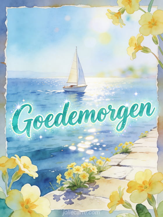 Stuur een vrolijke goedemorgenkaart met frisse teal aquarelletters, een kleine zeilboot op een zonnige blauwe baai en primula's langs een heldere stenen kade. Ontdek ook een goedemorgen en beste wensen, een klein bericht voor goedemorgen of een goedemorgen bericht voor haar lief.