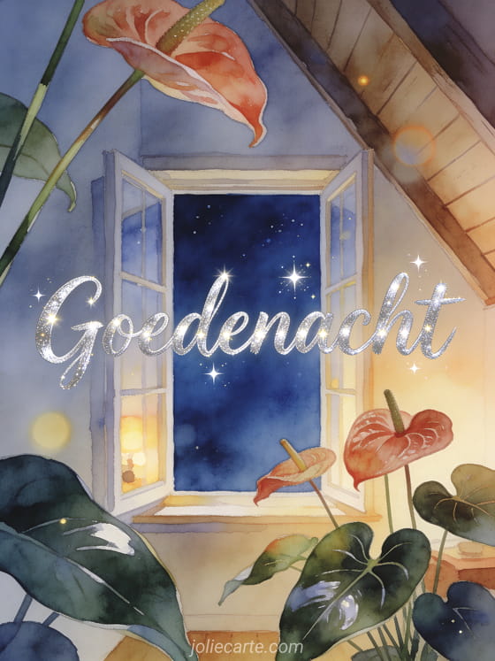 Deel goedenacht met lichtgevende zilveren letters, een gezellig zolderraam dat opent naar een diepblauwe nachthemel, anthuriumbloemen en glanzende bladeren in warm binnenlicht. Ontdek ook welterusten kusjes kaart, een welterusten bericht voor zijn vrouw of een mooi bericht om goedenacht te wensen.