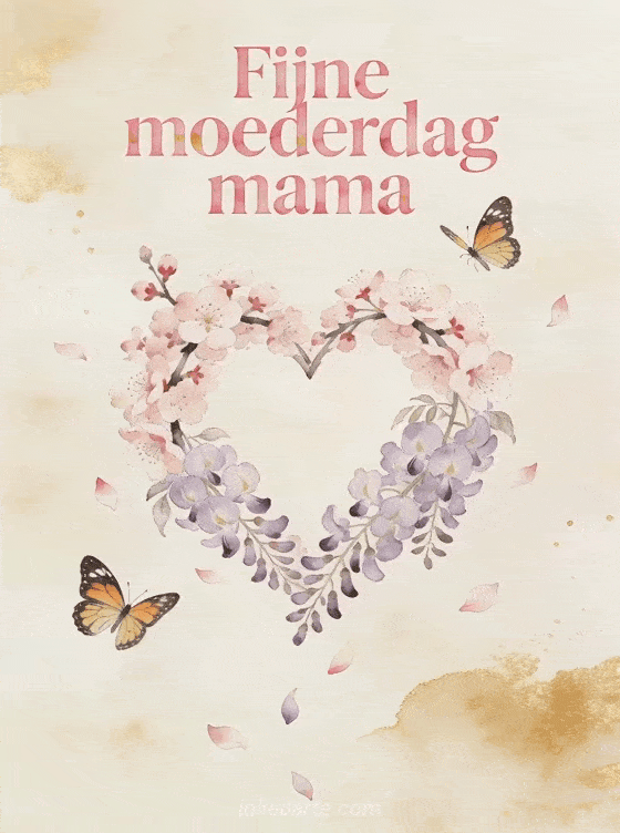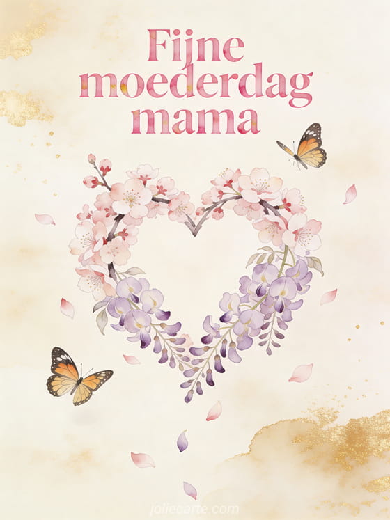 Verrass mama met deze prachtige gratis virtuele moederdagkaart met een krans van kersenbloesem en blauwe regen, omringd door vlinders. Bekijk ook een gratis afbeelding fijne moederdag of een kaart moederdag ps.