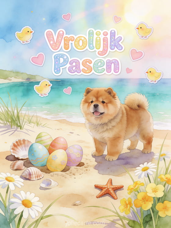 Stuur een vrolijke paaskaart met een schattige chow-chow puppy op een zandstrand met turquoise baai, kleurrijke paasei verspreid op het zand naast schelpen en zeesterren en lentemadeliefjes. Ontdek ook een kaarten voor pasen of een gratis digitale paaskaart.