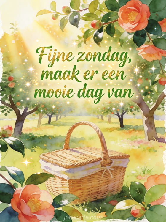 Deel een vrolijke zondag met groene kalligrafie, gouden glans en een picknickmand in een zonnige boomgaard. Deze gratis kaart wenst een mooie dag, met camelia's en glanzende bladeren voor een frisse en feestelijke sfeer. Bekijk ook een afbeelding fijne winterse zondag kaart, een mooie zondag kaart of een bericht van fijne zondag kaart.