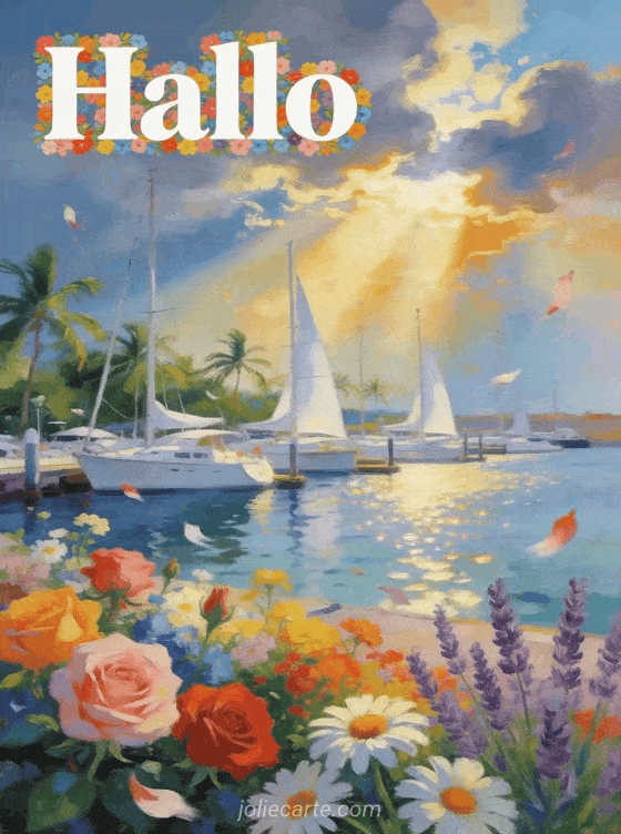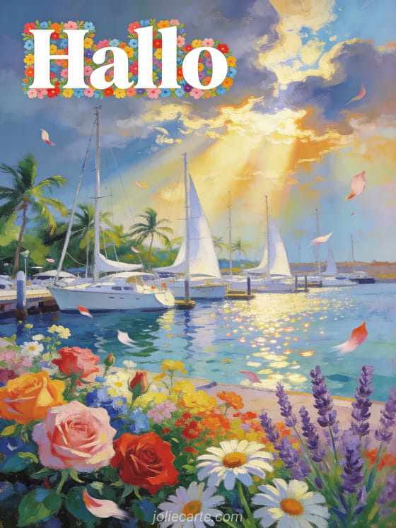Stuur een vrolijke kaart met een jachthaven vol witte zeilboten, palmbomen en kleurrijke bloemen om iemand warm hallo te zeggen. Bekijk ook een afbeelding hallo oktober, goedemorgen citaat of hallo lieve goedemorgen.