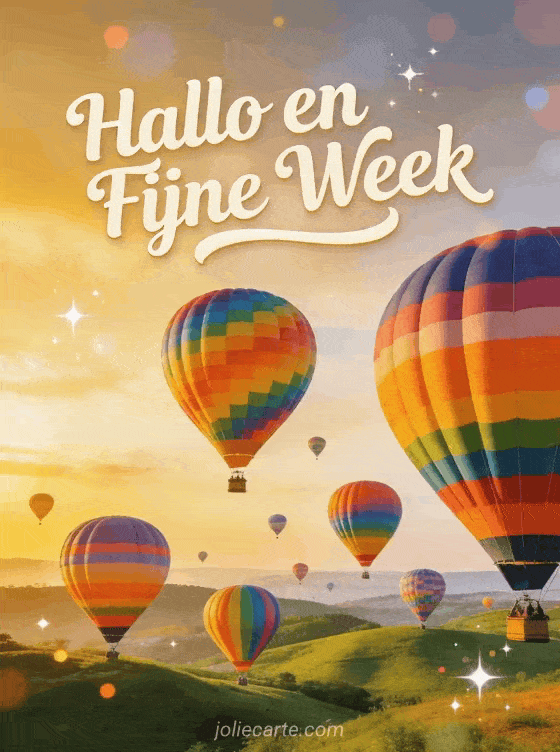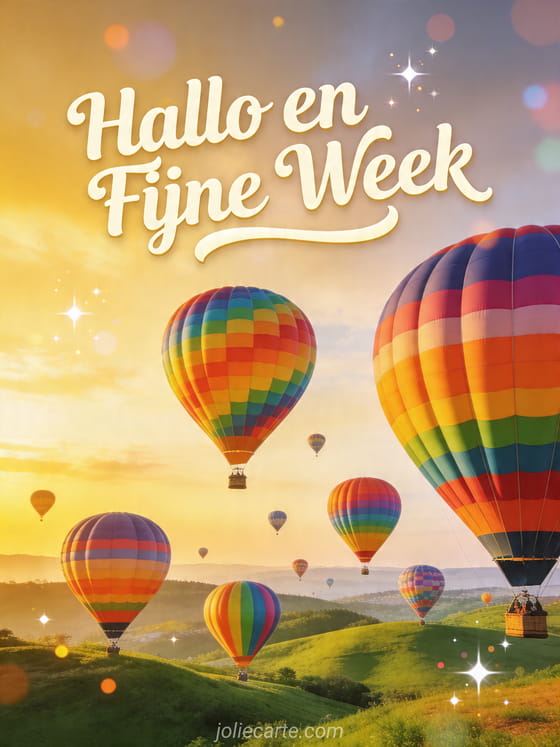 Deel een inspirerende Hallo en fijne week met deze gratis kaart waarop kleurrijke luchtballonnen boven groene heuvels opstijgen bij zonsopgang. Ontdek ook fijne week voor jou, fijne week kusjes of fijne week afbeeldingen.