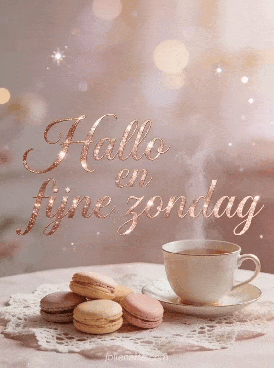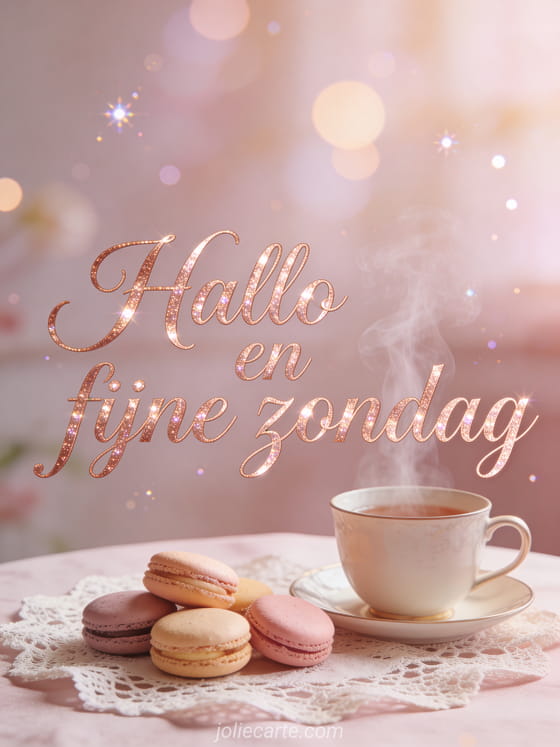 Deel een verfijnde groet met hallo en fijne zondag, roségouden letters, een dampende theekop en zoete macarons. Ontdek ook een fijne zondag knus afbeelding, heel mooie fijne zondag afbeeldingen of fijne zondag sprankelende geanimeerde gif geanimeerde gif.